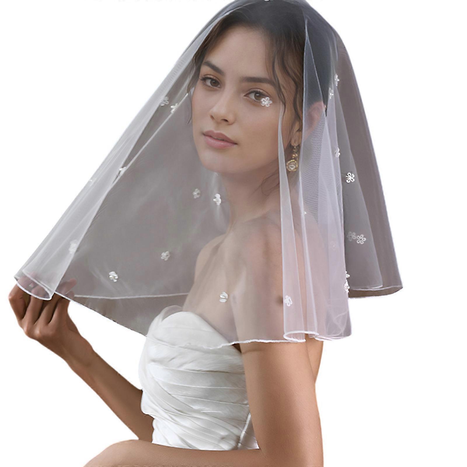 French Bridal Veil White Short Veil with Beadwork Flower Single Layer Veil for Wedding Celebration Travel Photography Multicolor