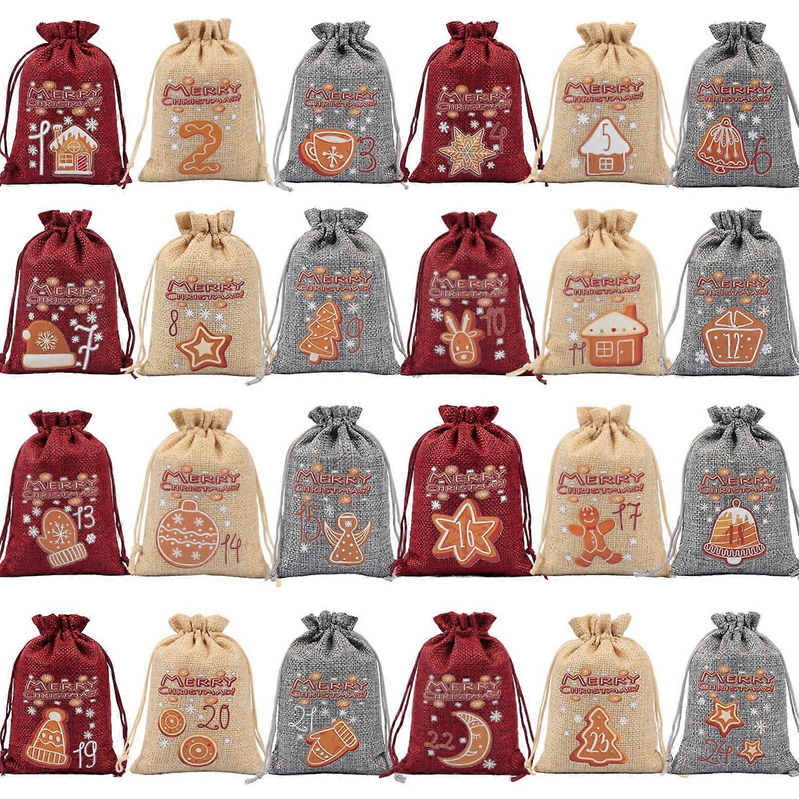 24 Pcs Christmas Burlap Gift Bags with Drawstrings, Small Treat Goody Bags for Xmas Holiday New Year Party Favors Supplies