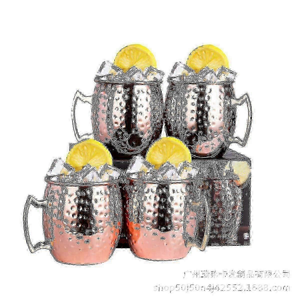 Handcrafted Copper Mugs for Moscow Mule Cocktails, set of 4 durable 16oz cups crafted from food-grade copper. Third-party safety certified for quality assurance, ensuring a safe drinking experience with every use. Large capacity design accommodates ice cubes and beverages without spills, perfect for home bars or parties. Superior craftsmanship features a polished finish and ergonomic handle for comfortable grip and stylish presentation. Note: Due to the light and screen setting difference, the item's color may be slightly different from the pictures. Please allow slight dimension difference due to different manual measurement.