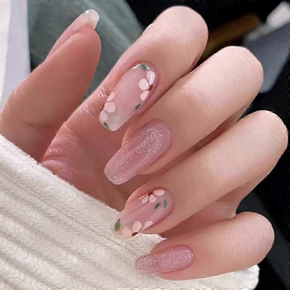 e Pink Press On Nails Acrylic Square Coffin Fake Nails Glossy Bling False Nails Medium Length Flower Artificial Full Cover Nails Tips Fo
