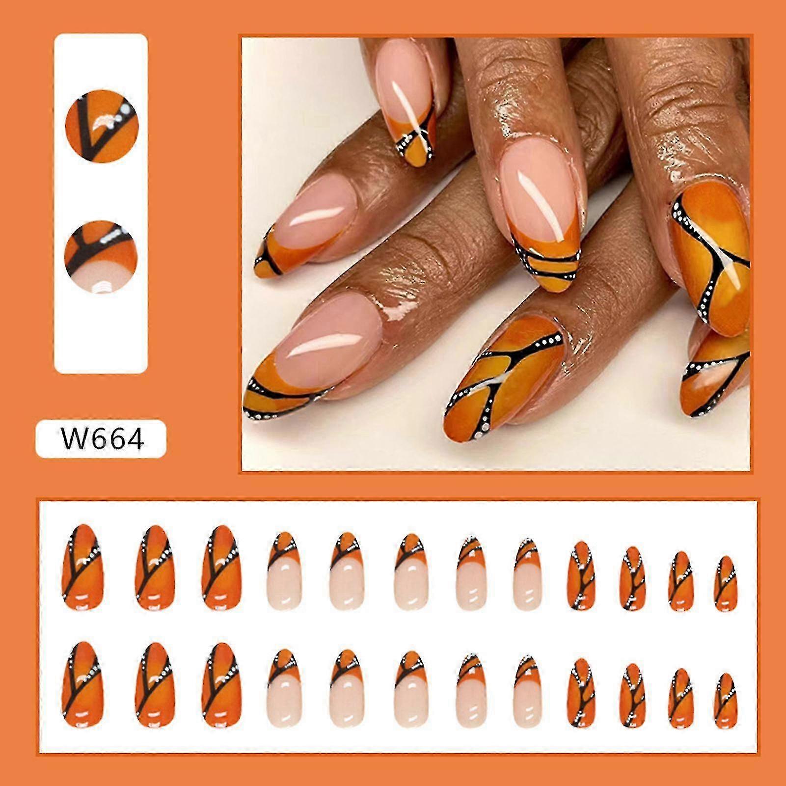 e Orange & Black Almond Fake Nails Glossy Almond Press On False Nails