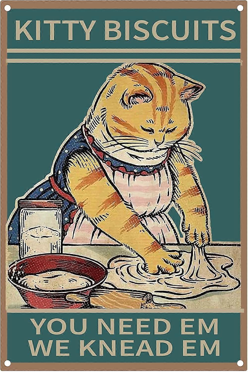 Cat Metal Tin Sign, Kitty Biscuits We Knead Em You Need, Funny Vintage Retro Poster, Compatible with Farmhouse Kitchen Cafe Wall Decor, 8x12inch