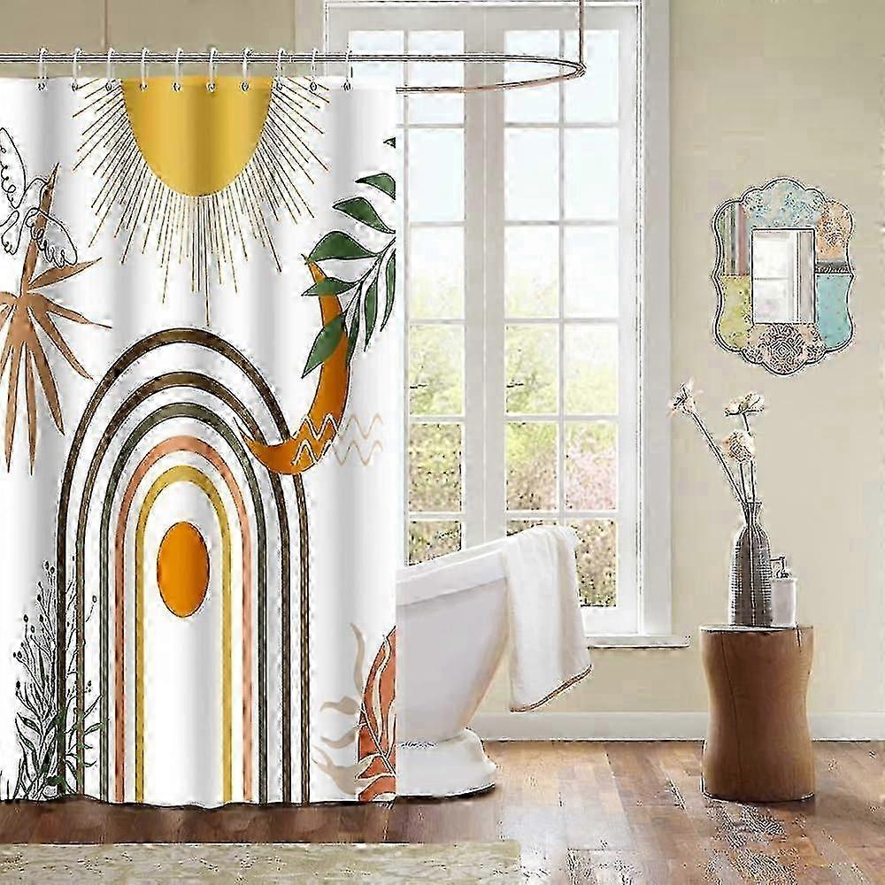 e Boho Shower Curtain, Mid Century Retro Warm Sunshine Green Palm Leaves Bathroom Decor Waterproof Rainbow Lines Pigeon Birds Bathtub Fa