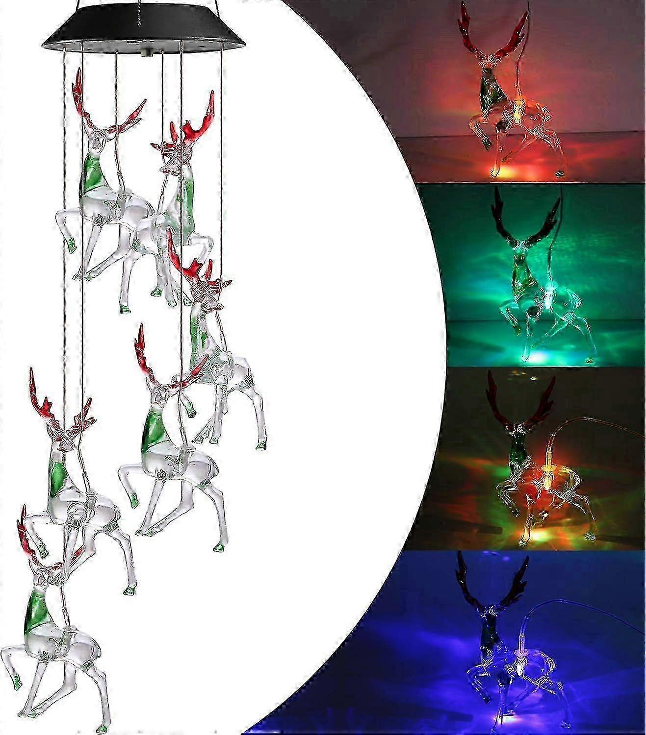 Solar Powered Wind Chime LightsFeaturing a unique design with 6 Christmas deers shaped lights charge automatically in the daytime and light up at night, free your hands, new version solar panel absorbs energy quickly, the solar wind chime can last up to 8-10 hours after fully charged.Gift for Mom, Gifts for Grandma, Mom Gift, Grandma Gift, Birthday Gift for Mom, Birthday Gift for Grandma 7 Colors Changing Outdoor Decorations LightThe solar Christmas mobile reindeer decorative lights change color alternatively between red, green, orange, blue, yellow, purple and white, one color gradually transitions into another creating a surreal visual effect, adds a charming display of lights and make your surroundings look dreamy and magical. This solar wind chimes will definitely perfect for your bedroom, patio, balcony, window or garden decoration. Easy to Use and EconomicalCome with swivel hook, easy to hang in garden tree, backyard, front porch, patio or anywhere you can, and set the switch to ON. The solar lights gather energy from the sun during the day, no need extra energy and eco-friendly. Just make sure the solar panel can get hours of sunlight to charge the built-in battery then you can enjoy your light show at night or dark. Indoor Outdoor Solar Decorative MobileThe waterproof solar outdoor Christmas lights LED deer wind chimes can be hung indoors and outdoors as a lovely day and night decoration, hear wind during the day and glowing as a nightlight after dark. Ideal for lawn, garden, patio, yard, hall, roof, living room, bed room decoration. Top Gift IdeaThis lovely solar wind chimes will give a surprise to your friends and families. Top gift choice for birthday, mother day, Thanksgiving, Christmas, Memorial day. Color changing LED Christmas Deer will make livable, enjoyable atmosphere. Note: Due to the light and screen setting difference, the item's color may be slightly different from the pictures. Please allow slight dimension difference due to different manual measurement.