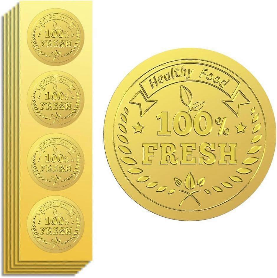 Gold Foil Stickers Seals Embossed 100% Fresh Healthy Food 2 Inch 100Pcs Self Adhesive Gold Around Embossing Medal Sticker for Food Bag Wrapper Baking