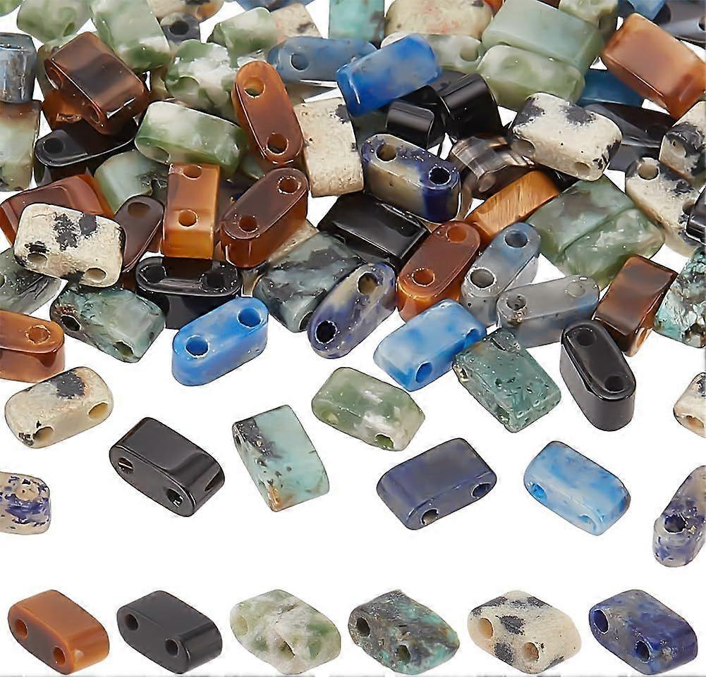 120pcs Half Beads 6 Styles Natural Gemstone Beads 2-Hole Flat Spacer Beads Rectangle Loose Beads Charms Multi-Strand Linking Connectors for Bracelets
