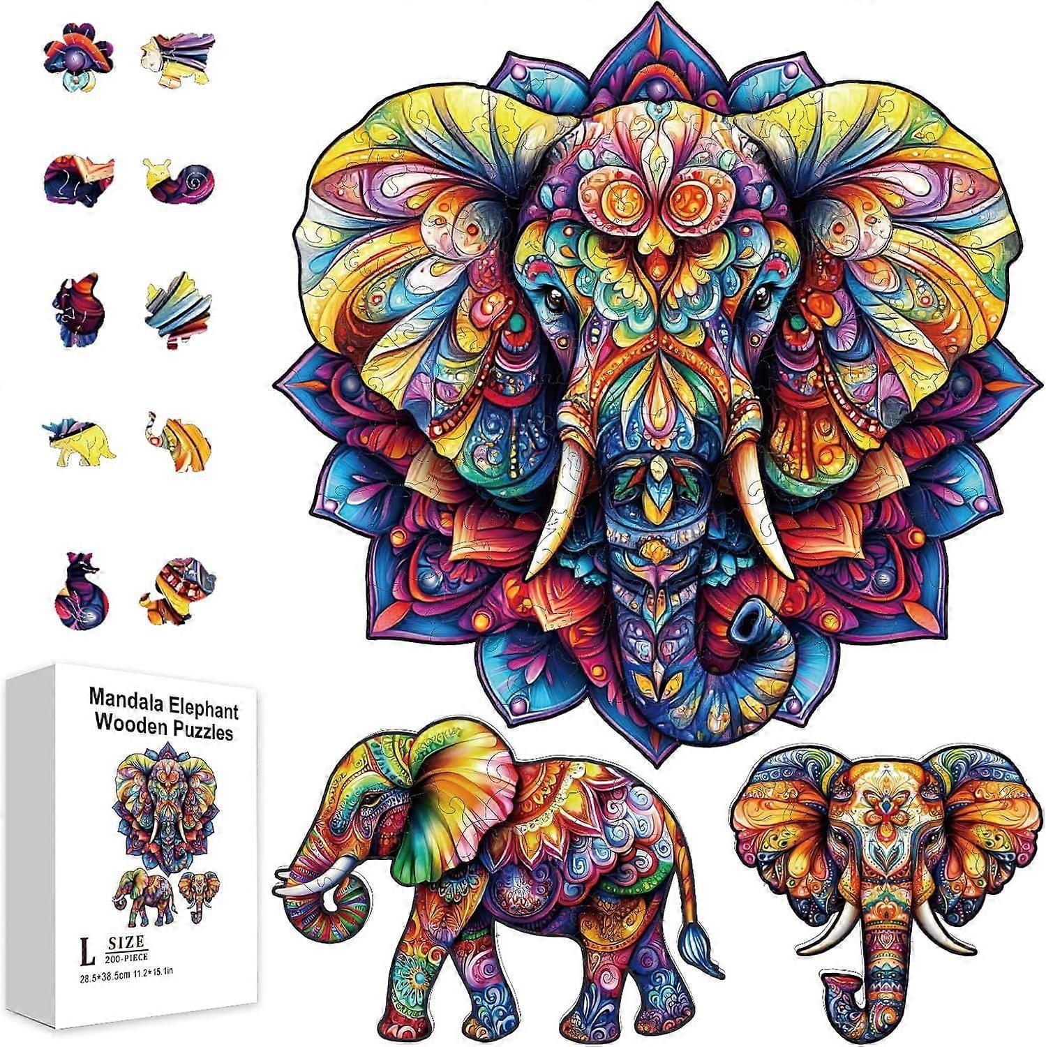 200Pcs Mandala Elephant Wooden Jigsaw Puzzles for Adults Learning Animal Elephant Wooden Puzzles Colorful Unique Shaped Wood Puzzles Birthday Gifts fo