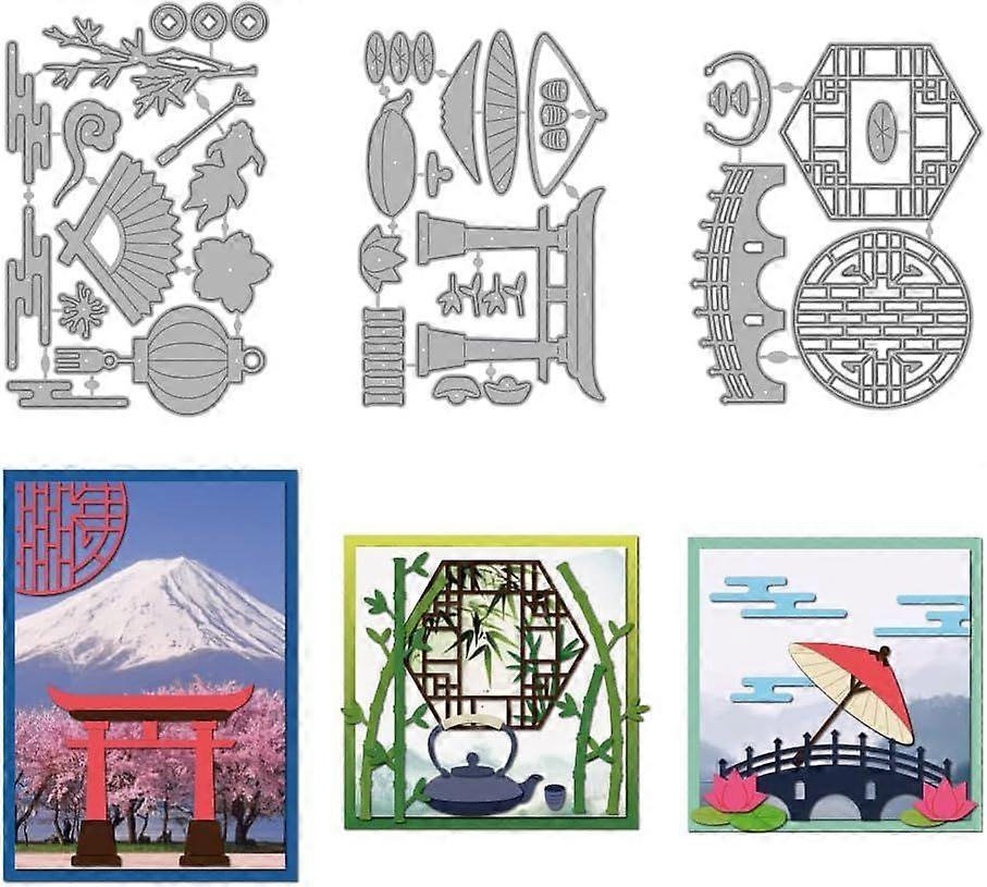 Oriental Buildings Die Cuts for Card Making Bamboo Window Bridge Metal Cutting Dies Lotus Lantern Embossing Cutting Stencil for Scrapbooking Craft Pap