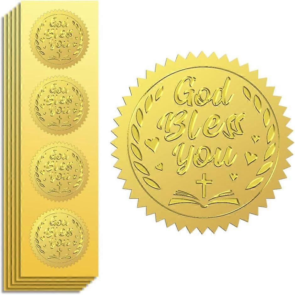 Gold Foil Stickers Seals Embossed God Bless You 2 Inch 100Pcs Self Adhesive Gold Around Embossing Sticker for Christian Envelope Seals Gift Card Thank