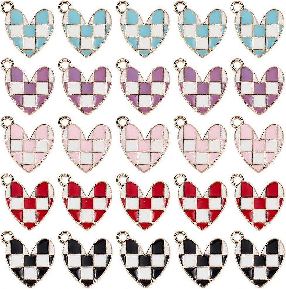 1 Box 30Pcs 5 Colors Enamel Heart Charms Checkered Charm Metal Red Purple Black Blue Pink Love Hearts Charm for Jewelry Making Charms Valentine's Day