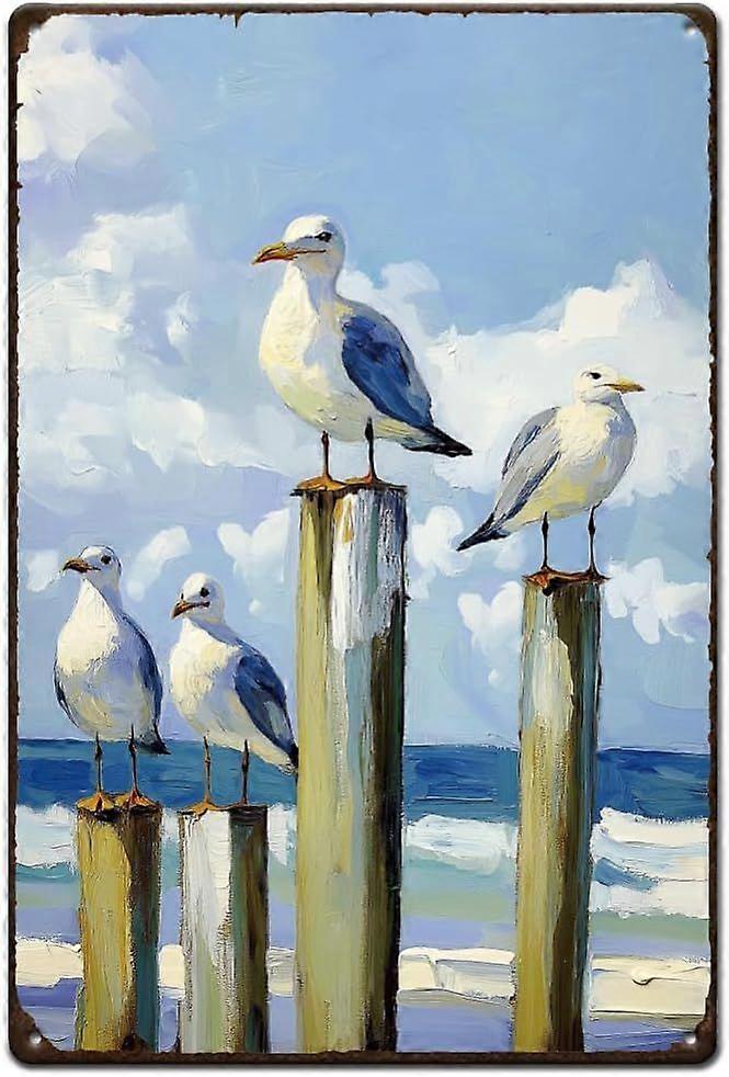 Seagull Metal Signs Ocean Tin Sign Sea Bird Vintage Tin Signs Beach Wall Art Oil Painting Style Wall Poster Decor for Living Room Kitchen Bedroom Beac