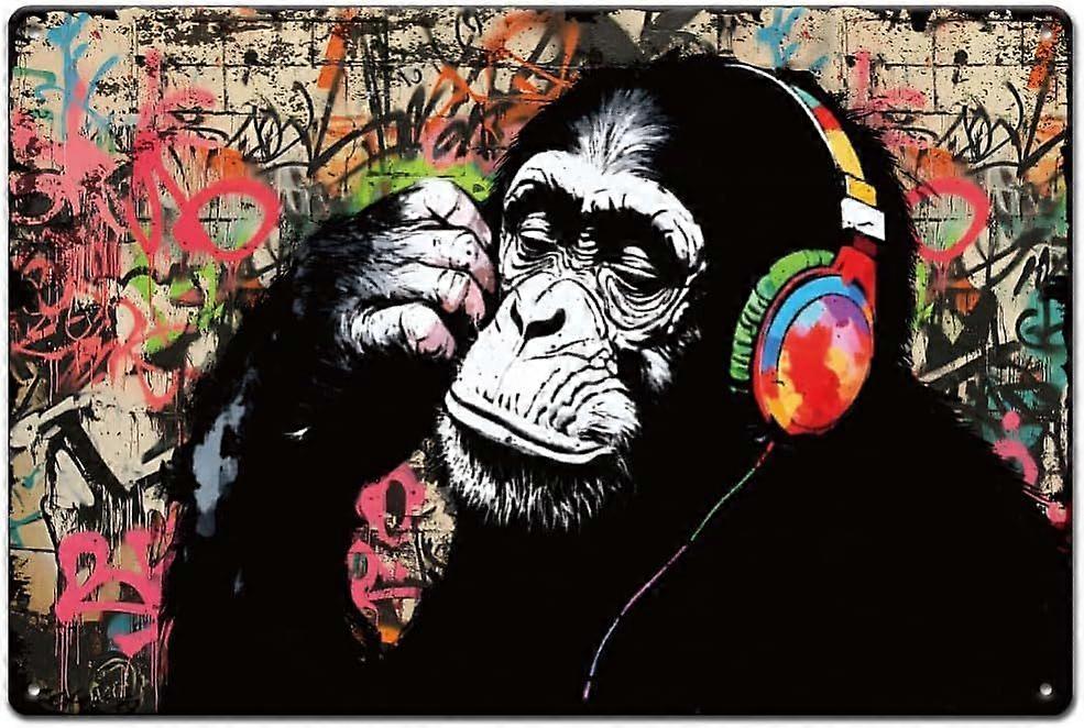 Headphones Monkey Metal Signs Banksy Graffiti Tin Sign Thinking Monkey Vintage Tin Signs Abstract Wall Art Funny Retro Decor for Boys' Room Playroom M