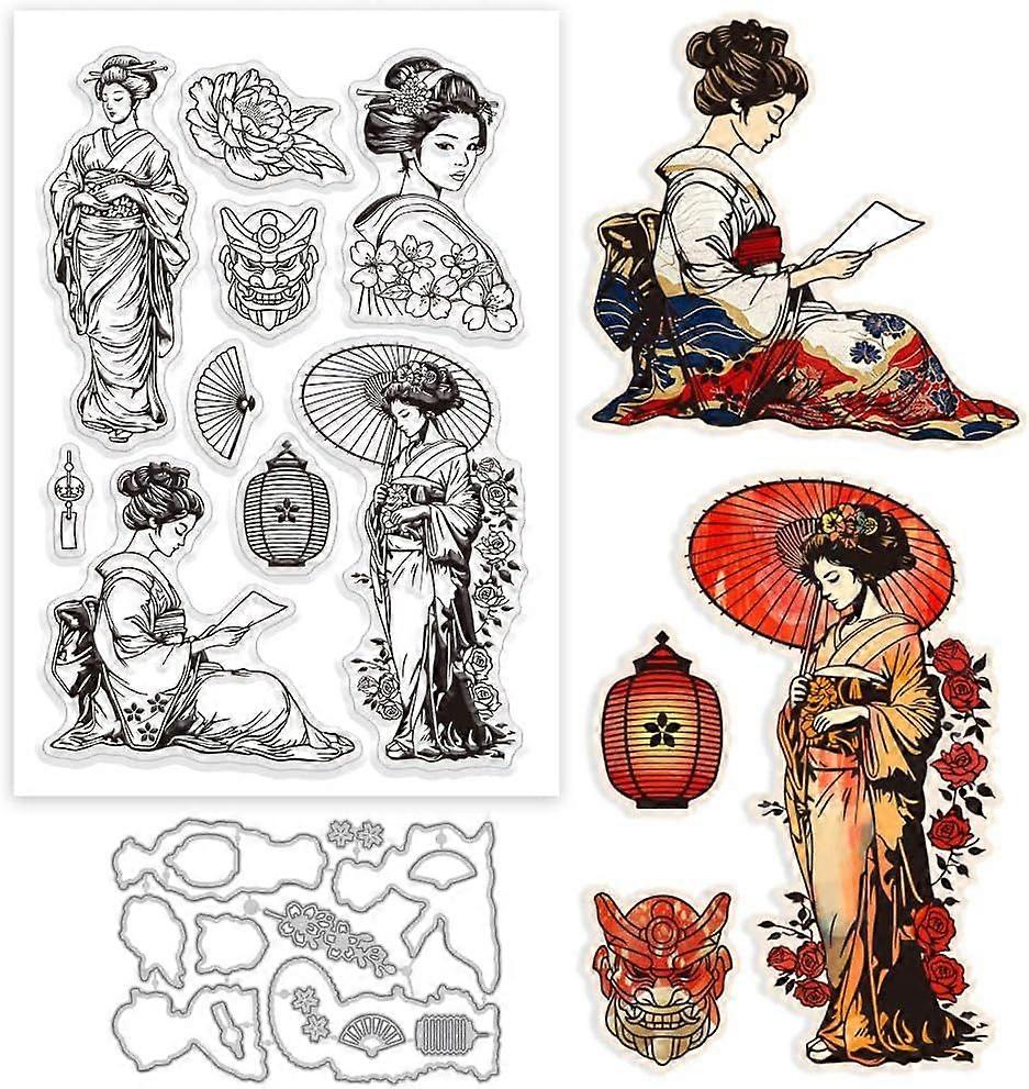 Japan Oriental Geisha Clear Stamp and Cutting Dies Set for Card Making Flowers Peony Silicone Clear Stamp Metal Lantern Die Cuts for DIY Scrapbooking