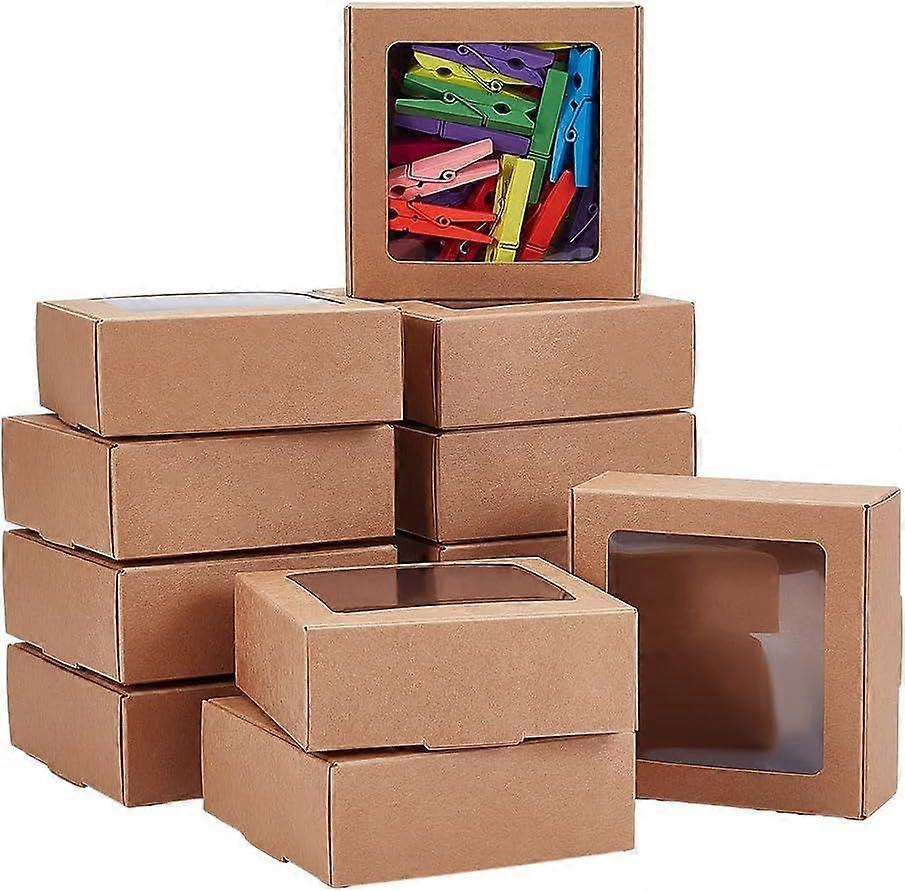48Pcs 3.7x3.7x1.4inch Square Brown Kraft Paper Boxes with Clear Windows for Wedding Party Favor Bakery Jewelry Festival Gift Packaging