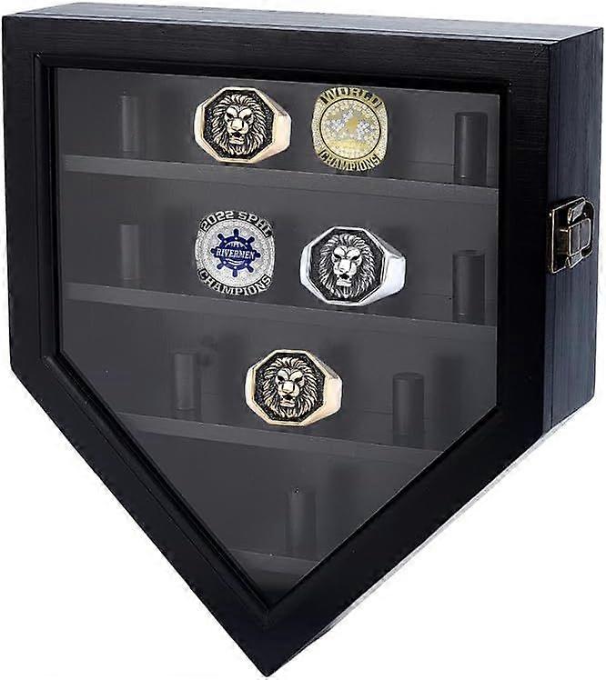 Baseball Ring Holder 12 Ring Posts Championship Ring Display Case Wooden Wall Mount Shadow Box Black Ring Organizer Display Stands for Collection Mult