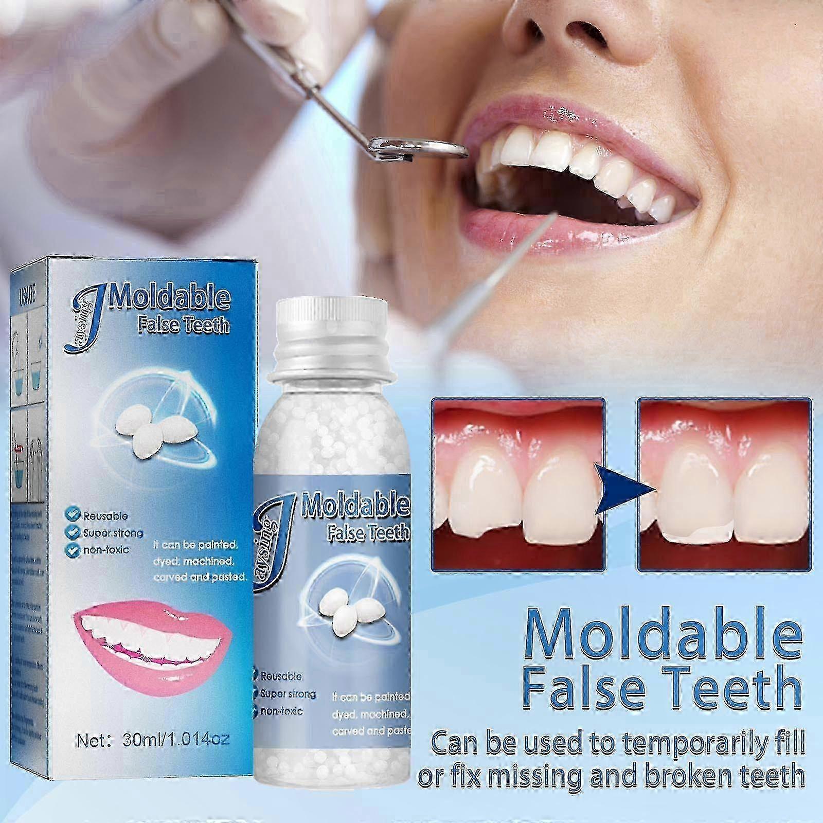 Tooth Repair Granules Temporary Tooth Repair Kit Thermal Beads Teeth Repair Kit Reusable 2PC FEATURES: 1. Shape and size are appropriate to wear on your front or back teeth. 2. Made from natural resin-based materials, tasteless, not absorbed by the human body, and reusable. 3. Easy to operate with no special tools required; application completes in a few minutes with strong adhesion that resists falling off. 4. Helps prevent movement of prepared teeth. 5. Suitable for use with oversized teeth, chipped teeth, missing teeth, or cosmetic dental applications. HOW TO USE: 1. Prepare a cup of boiling water and add approximately 15 gel beads (for fangs). 2. Stir in the cup until the gel becomes transparent. 3. Allow the gel to cool for about 5 seconds after removing it from the water. Then place the gel into the fang slot to attach the fangs to your teeth. Use your fingers to apply the gel to the gaps between teeth and the inner surface of the teeth to create a secure fit. 4. Remove the tooth form and let it cool for several minutes until the gel turns white. 5. Repeat these steps for additional fangs. Note that these forms can be reused multiple times. SPECIFICATIONS: Material: Resin Weight: 10 mL Function: Dental Filling Application