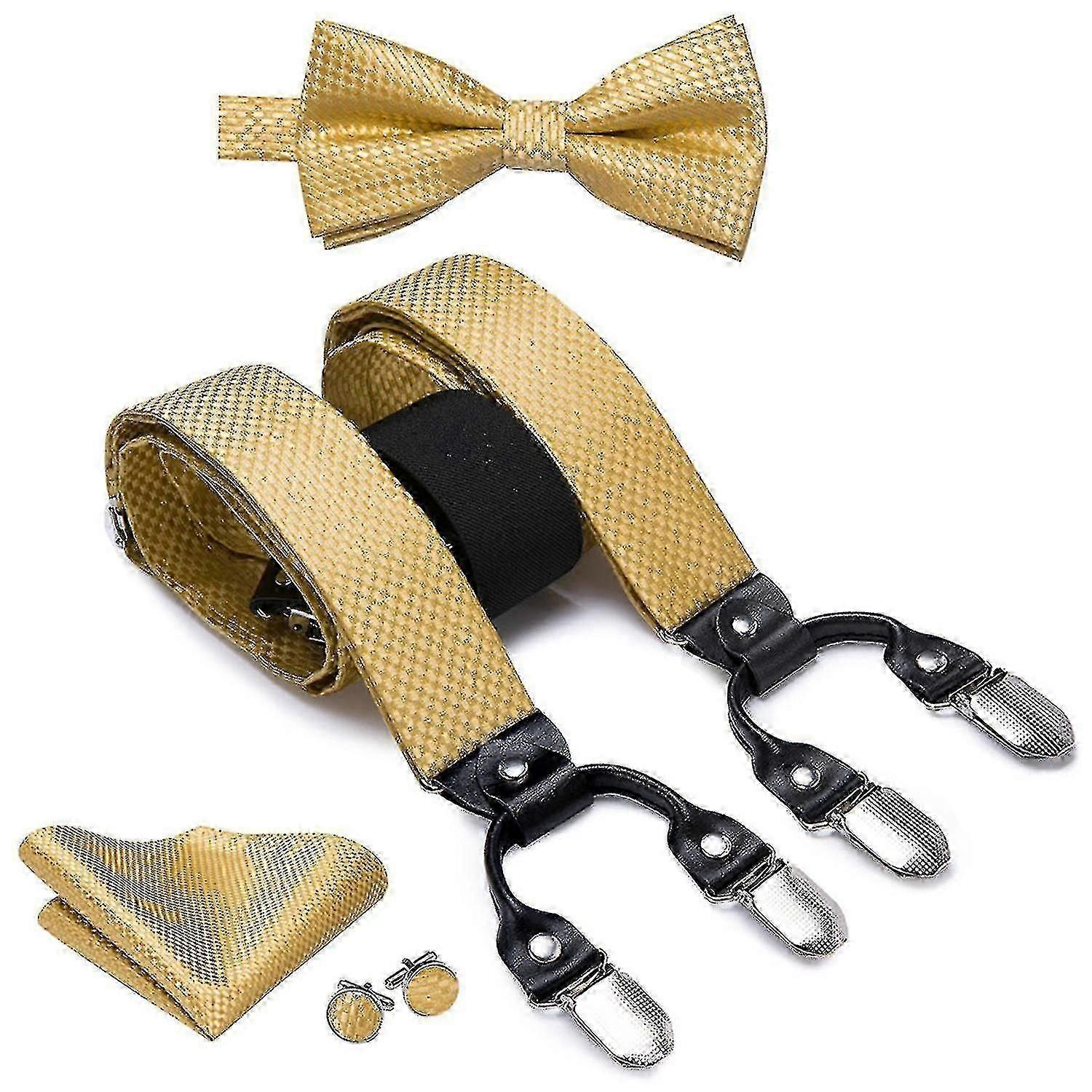 for Silk Men's Suspenders Set Gold Plain Jacquard 6 Clips Male Braces Bowtie Hanky Cufflinks Black Leather Y Back Straps Gift Bdtz-3026