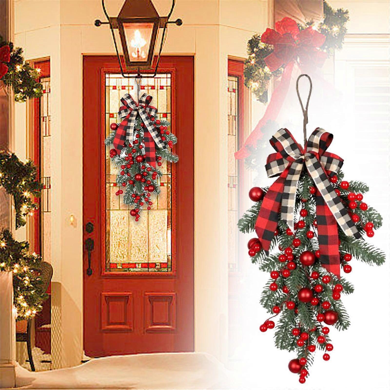 Federra Christmas Teardrop With Light Artificial Door Red Berry Wreath With Plaid Bow For Front Door Wall Holiday Farmhouse Decor