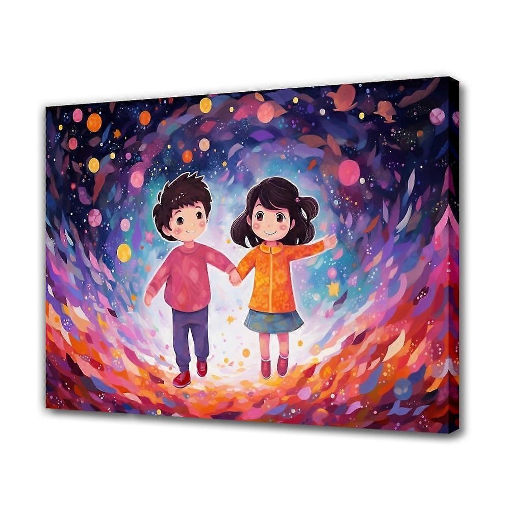 Cartoon Kids Racing Through Colorful Cosmic Tunnel with Stars & Bubbles Canvas Poster, 16x24inch, Frame-style, compatible with bedroom, office decor