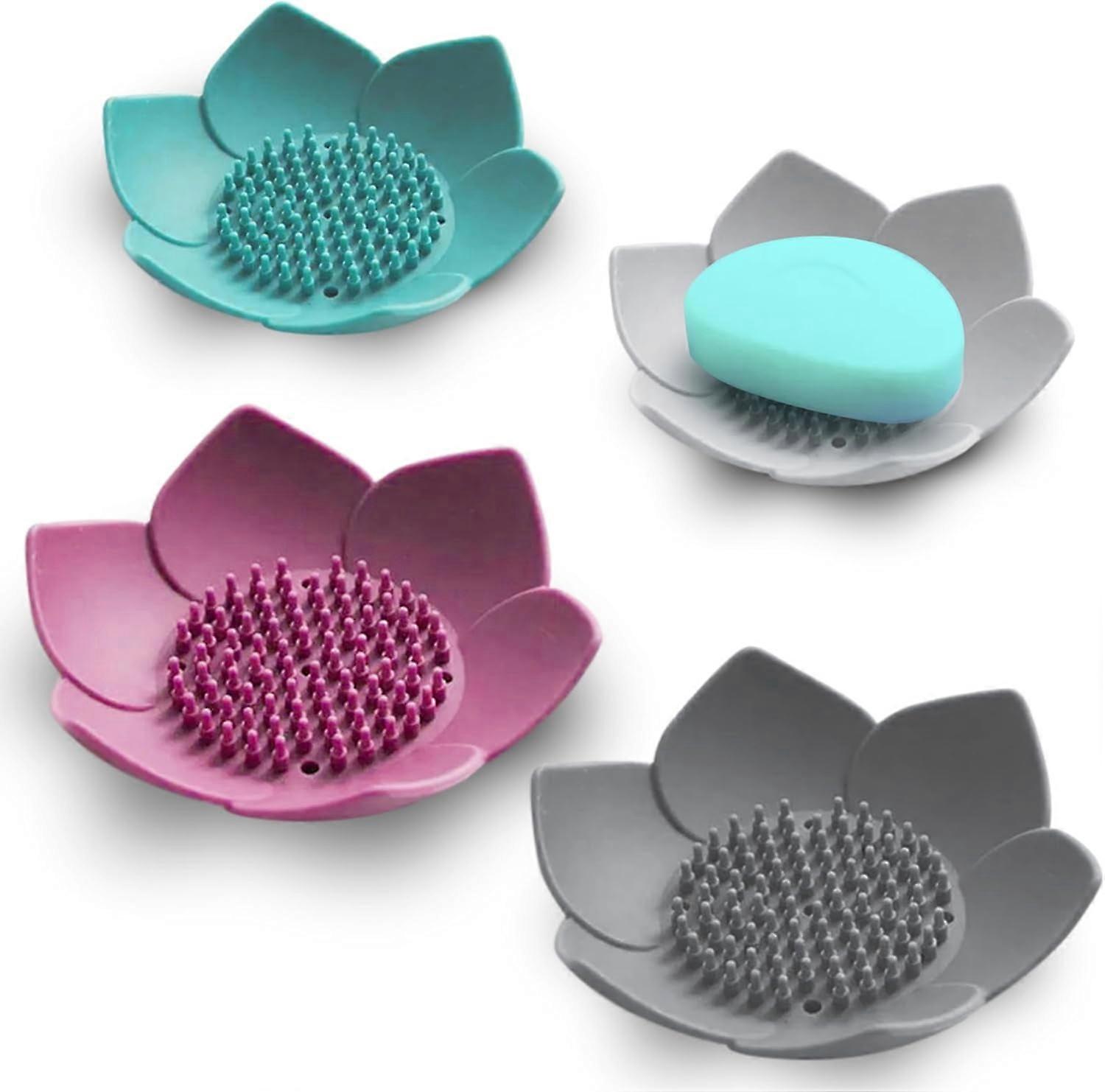 4-Pack Lotus Silicone Soap Dish, Holder, Saver, Non-Slip with Drainage for Shower, Kitchen, Bathtub (Grey, White, Purple, Blue)