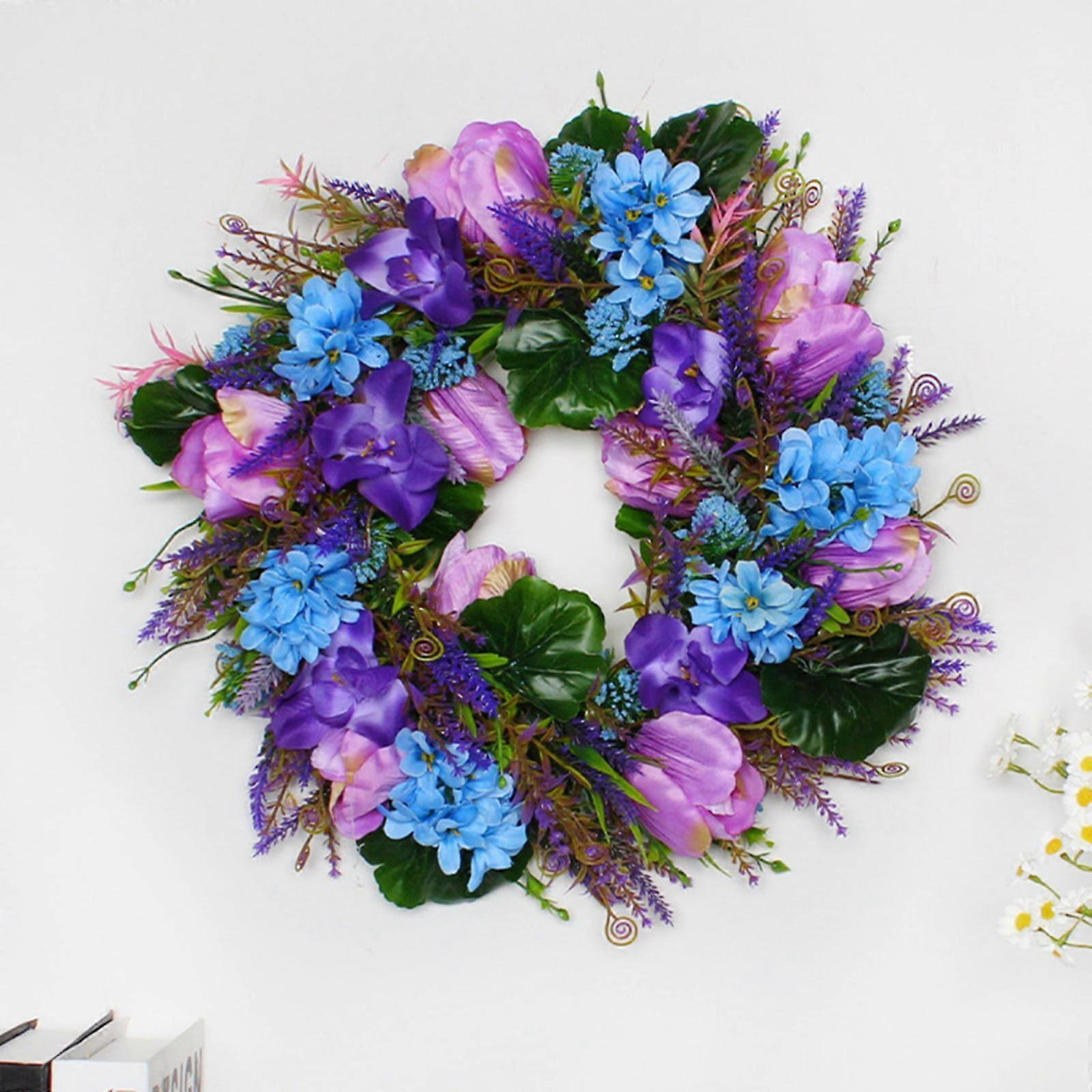 14" Artificial Lavender Tulip Wreath with Berries & Green Leaves, Handmade Purple Floral Spring Summer Decor for Door, Wall, Window