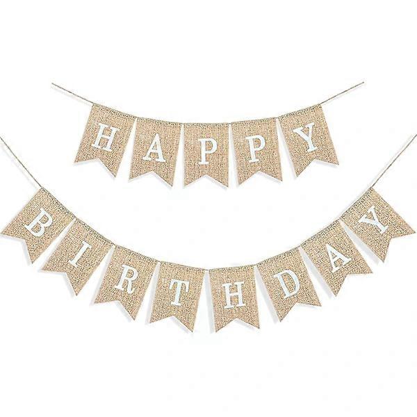 Happy Birthday Banner for Birthday Party Decorations, Rustic Burlap Pennant Chevron, 2 in 1, Linen White