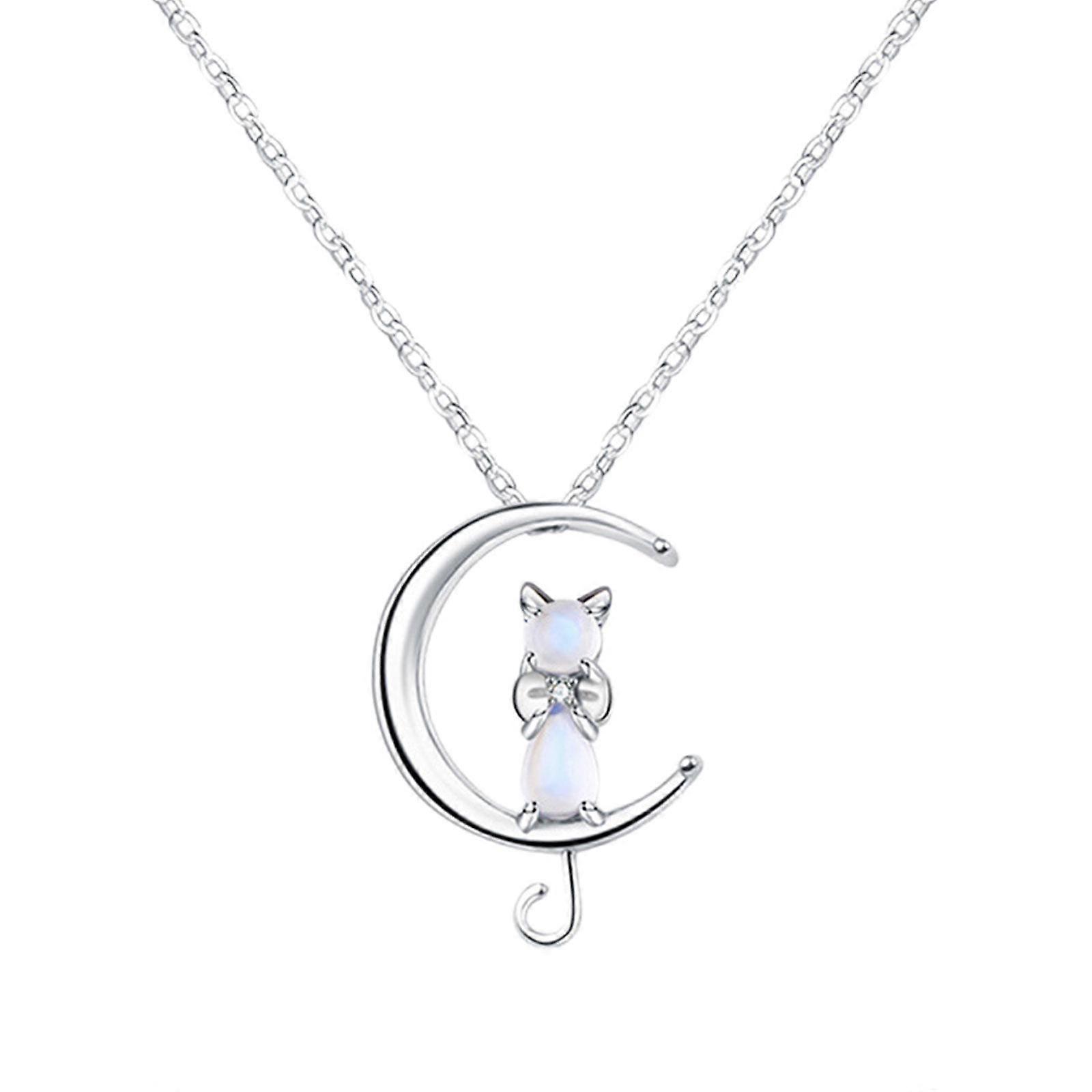 Moon Cat Necklace Sterling Silver Plated Copper Jewelry Gift For Women Birthday Christmas