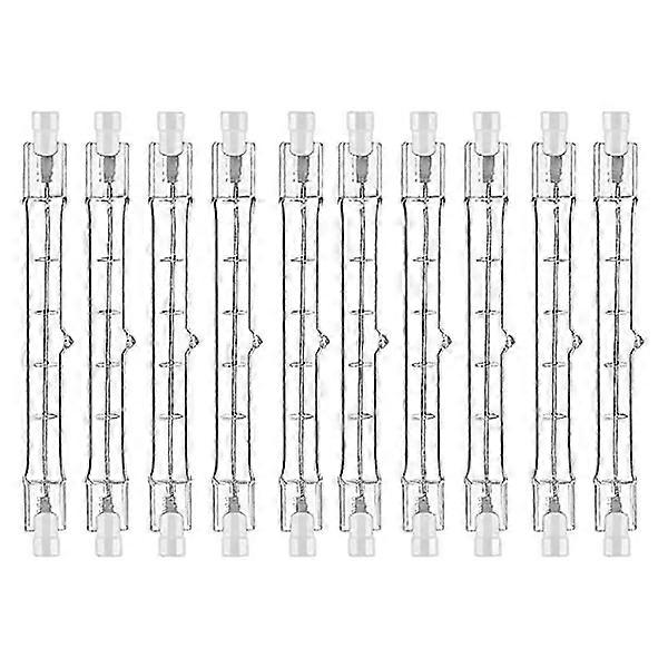 High performance R7S halogen 200W, 2000 . Voltage 230V. Length 4.65 inches 118mm. Direct replacement for all T3 118mm R7S double ended fixtures. Lasts an average of 2500 hours, reducing the frequency of replacing R7S halogen bulbs. Please measure the size of your lamp base before purchasing, 118mm base, not 78mmExcellent performance high quality halogen. Wide beam angle of 360. J type 118mm double ended halogen bulb 200 suitable for R7s base type. This is a clear glass that gives a warm white yellow lighting of 2700K with all suitable lamps and gives a 99 which allows us to see the color brilliance of objects under this light. At some point it would be hot due to the properties of the halogen bulb.Eye protection dimmable R7S haloline lamps R7S J118 dimmable halogen rod 118 mm, which can adjust the brightness via dimmer. No flicker, protects your and your familys eyes. No hazardous emissions, no UV or IR radiation, perfect for environmental protection.Wide application halogen R7s rods R7S 118 mm T3 halogen lamp for floodlights, shop and office, construction floodlights halogen, work and safety lighting, showrooms, stage and studio lighting, flooring, landscape lighting, etc.Color TransparentMaterial glassPackage contents10R7S Halogen lightOnly the above package contents, other products are not included.Note Light reflection and different displays may cause the color of the item in the picture to be slightly different from the real thing. The allowable measurement error is13 cm.