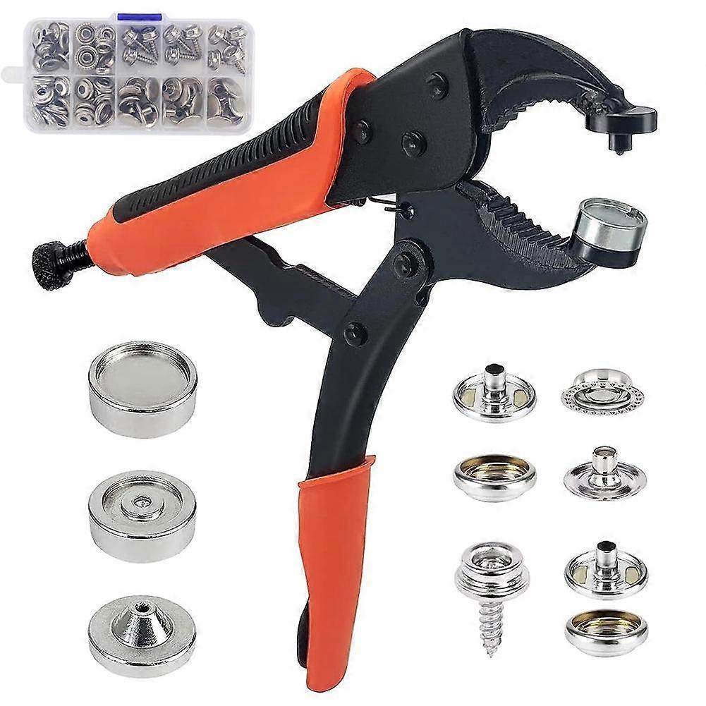 Specifications: Material of snap fasteners: stainless steel material Snap Buttons quantity: 20 * Silver Buttons Sets Stud Cap Dimension: 15mm/0.59 inch Pliers colour: Orange Material of pliers: The head is made of steel,the sheath is TPR Description: ADJUSTABLE PLIERS: The Adjustable Pliers feature non-slip grips and soft rubberized sleeves to provide a comfortable grip. It also features a mechanical lever vise grip system, which helps to easily install the clasp. Easy to carry and use: The molds have a magnetic design that prevents them from falling off while you work. You can use this tool for quick and easy installation, saving time and efficiency. The snap kit comes in a clear plastic case for easy storage and portability. STURDY: The snap kit is made of high-quality marine grade stainless steel, which is rust-resistant and resistant to deformation, ensuring long-term use. It can be adapted to various environments WIDELY USED: This portable snap kit is suitable for a variety of scenarios, can be used for boat covers, tarpaulins, marine canvas, tents, garments, leather snap installations and replacements, or DIY crafts. Snap tool is suitable for both indoor and outdoor use, it works with different types of materials and fabrics. EASY TO USE: With this tool, you can install snaps quickly and easily. This will save your time and increase your work efficiency! Package Includes: Snap fastener pliers+20 * Silver Buttons Sets