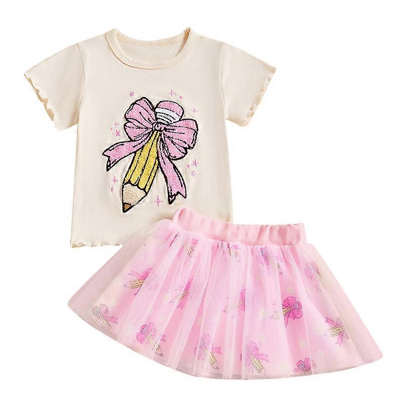 Toddler Girls 2Pcs Summer Outfits Short Sleeve Pencil Embroidery Tops Mesh Skirt Set Back to School Clothes