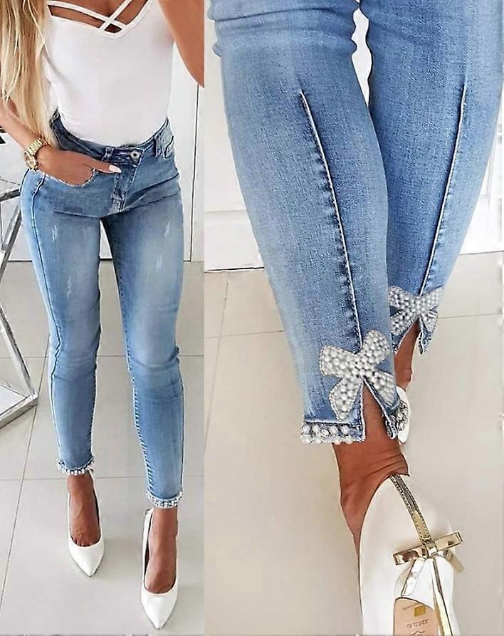 Women's Fashion Denim Runners 2024 Summer Late Casual Rhinestone Beaded Slit Bowknot Jeans Skinny Zipper High Waist Pocket Pants