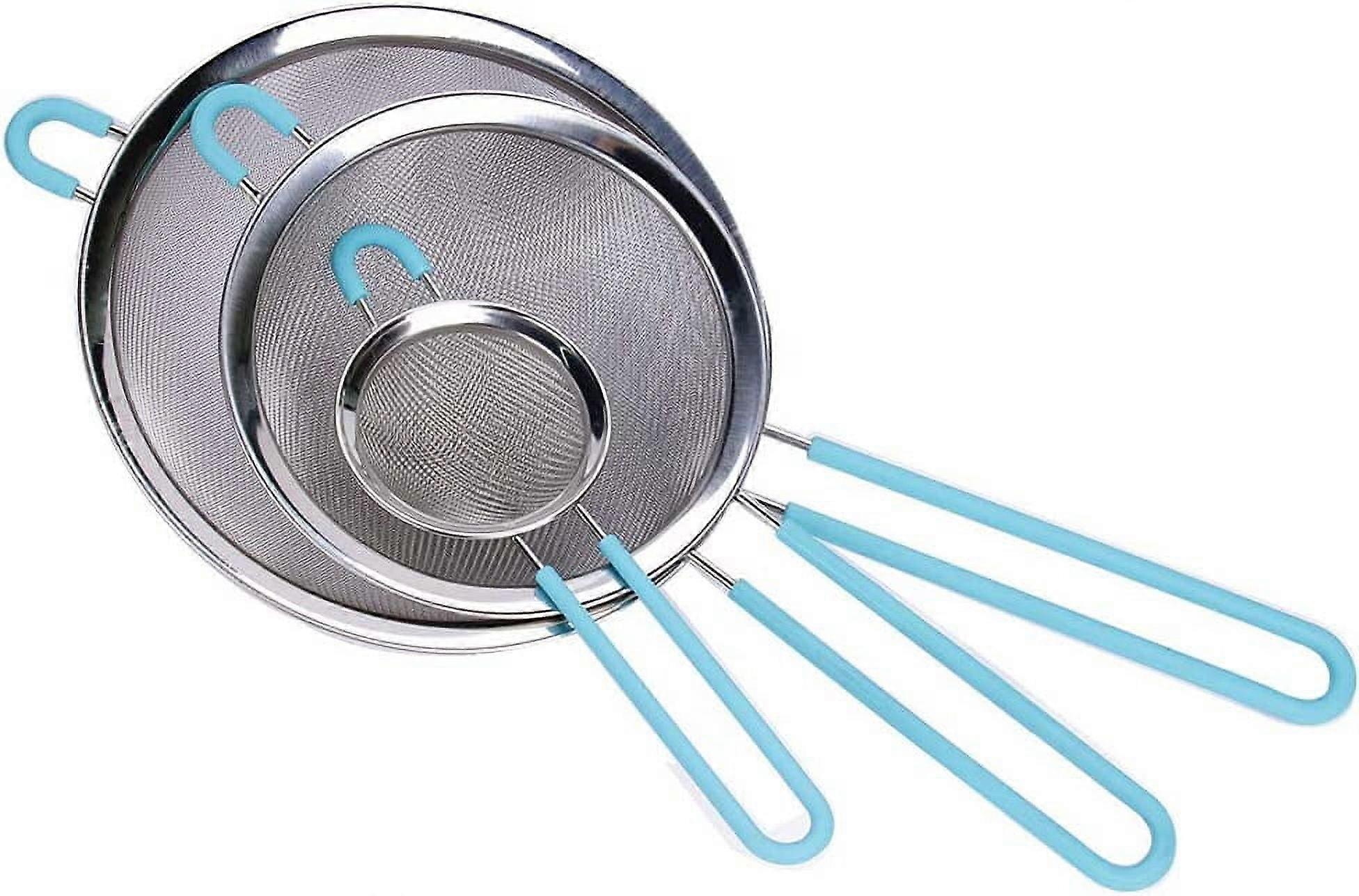 Set of 3 Stainless Steel Fine Mesh Strainers with Silicone Handle, 3.15", 6.22", 7.87" - Ideal for Pasta, Tea, Sift Flour & Powdered Sugar