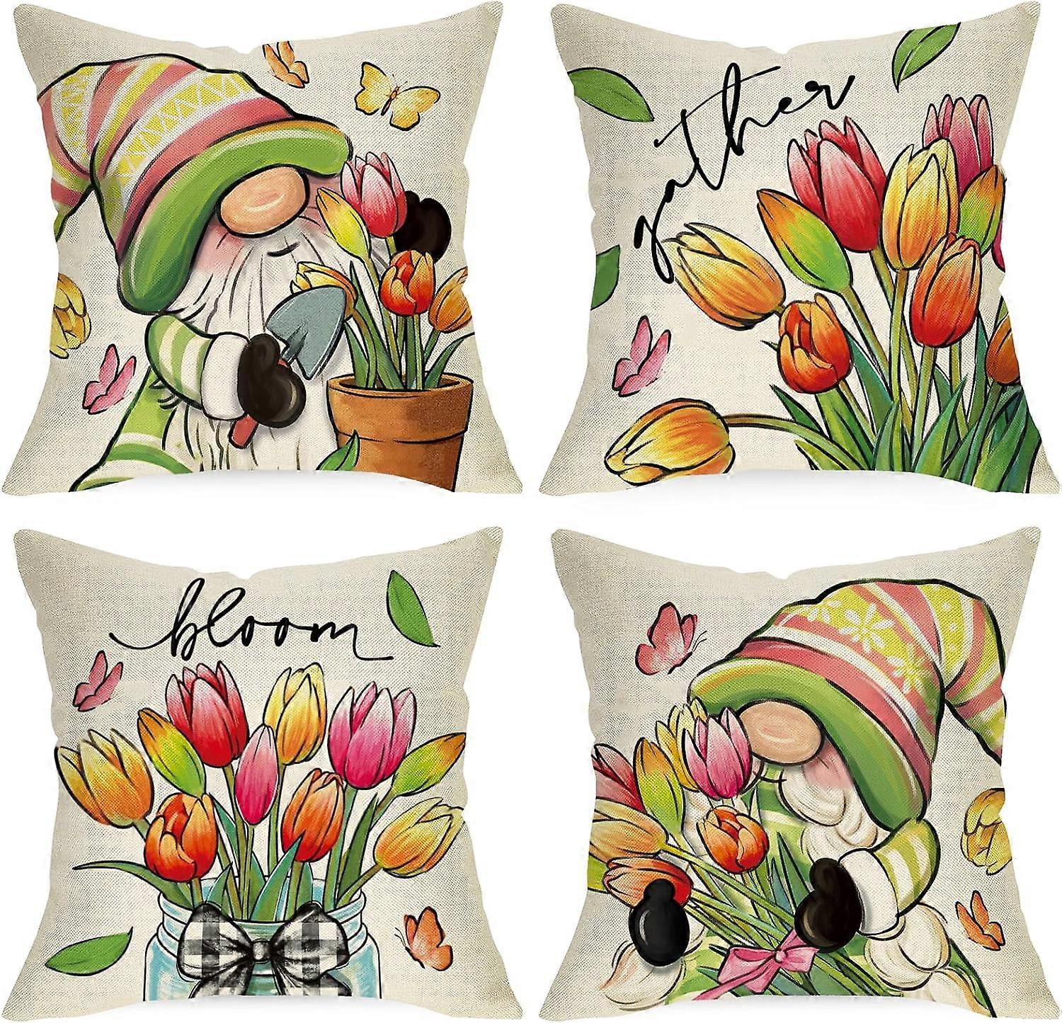 Spring Summer Gnome Decorative Pillow Covers 18x18 Set of 4, Tulip Flower Mason Jar Gather Bloom Cushion Case, Floral Pot Butterfly Sofa Decor