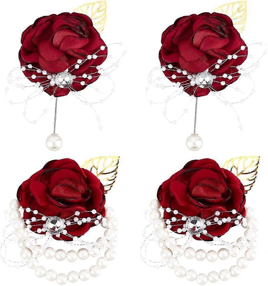 2 Sets Rose Wrist Corsage with Pearl Stretch Bracelets, Artificial Silk Flower Boutonniere for Bride & Bridesmaid Wedding Accessory