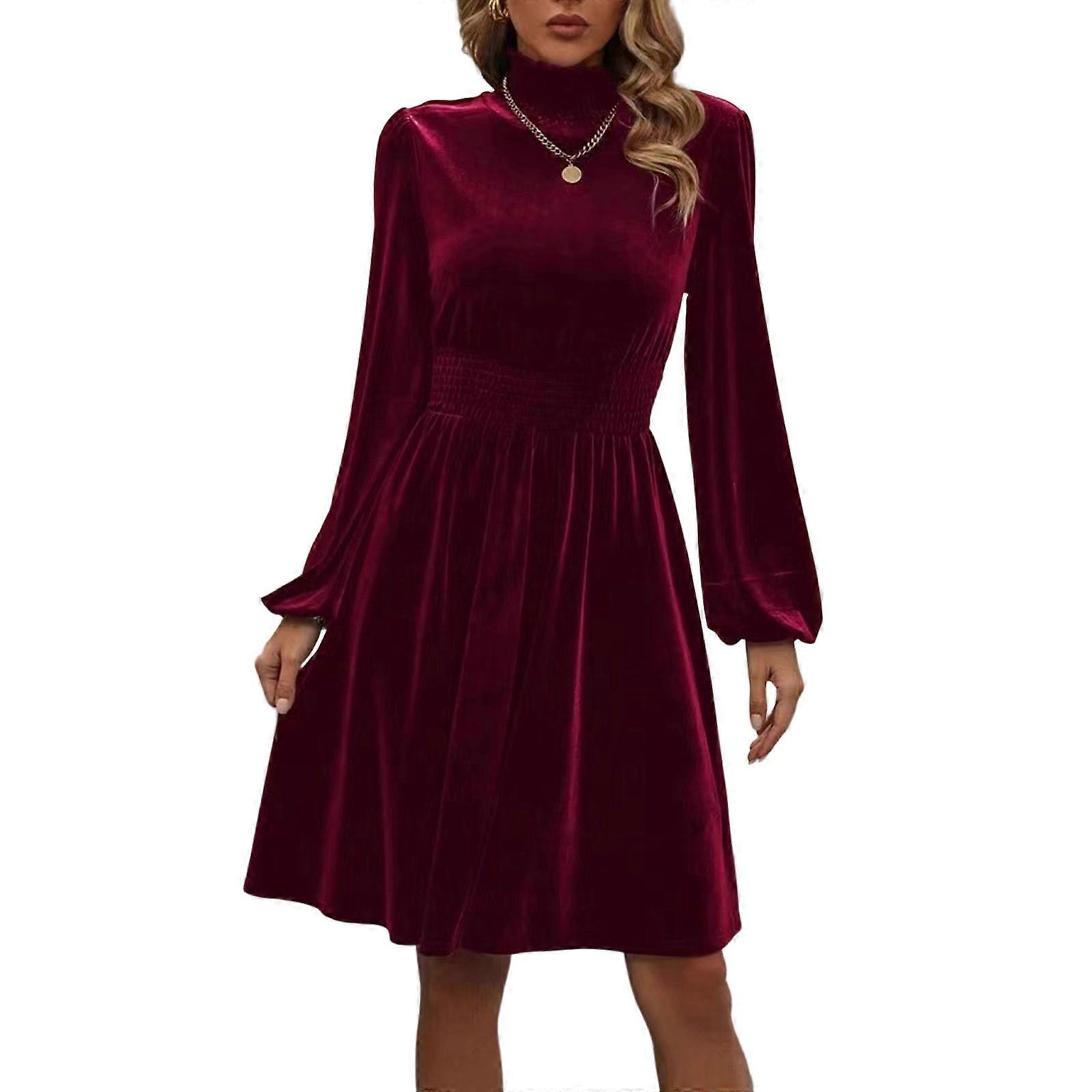 Retro velvet women's long-sleeved round neck pleated A-line skirt Burgundy XL