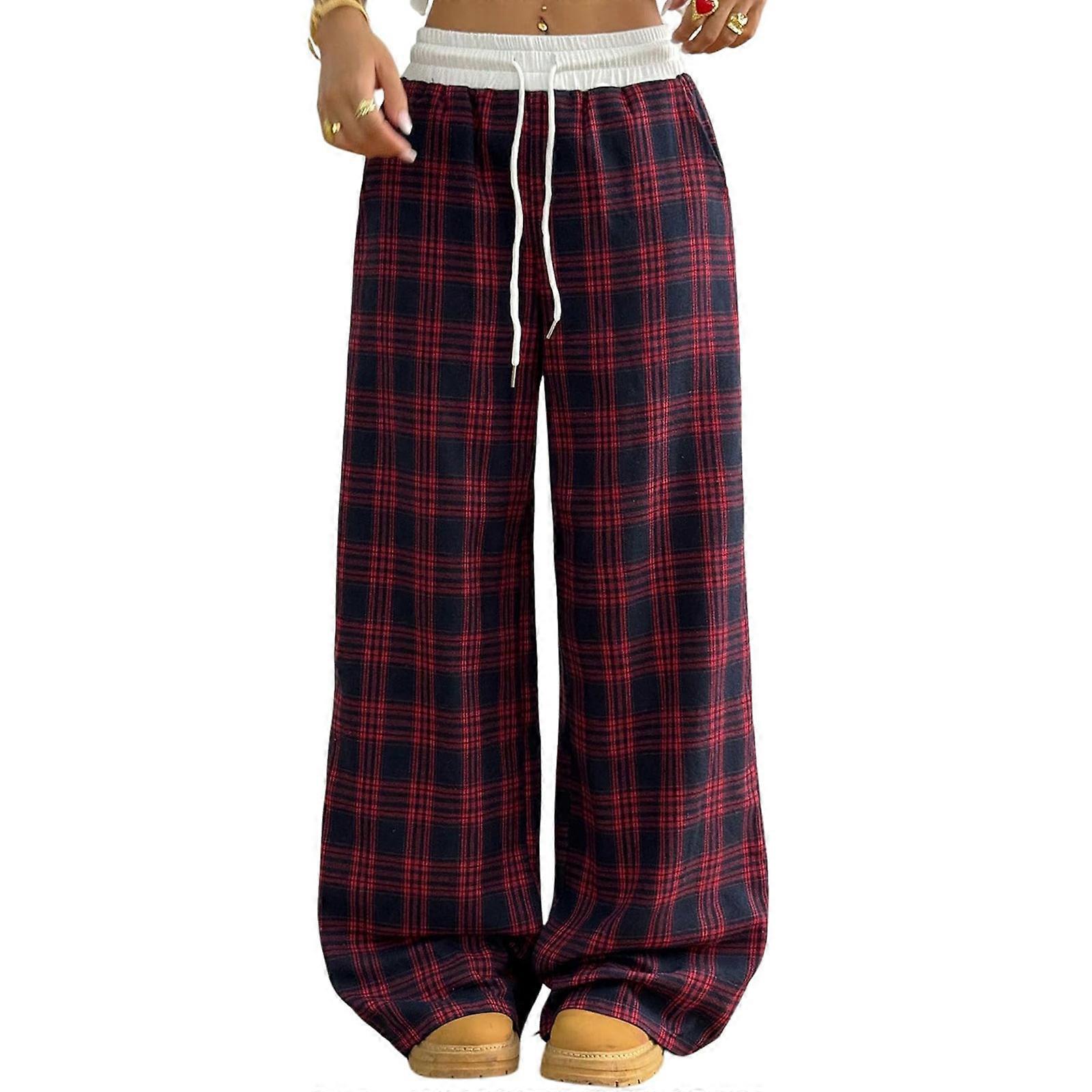 Women's flannel pajama pants, casual wide-leg loose-fitting sports pants with pockets Burgundy XL