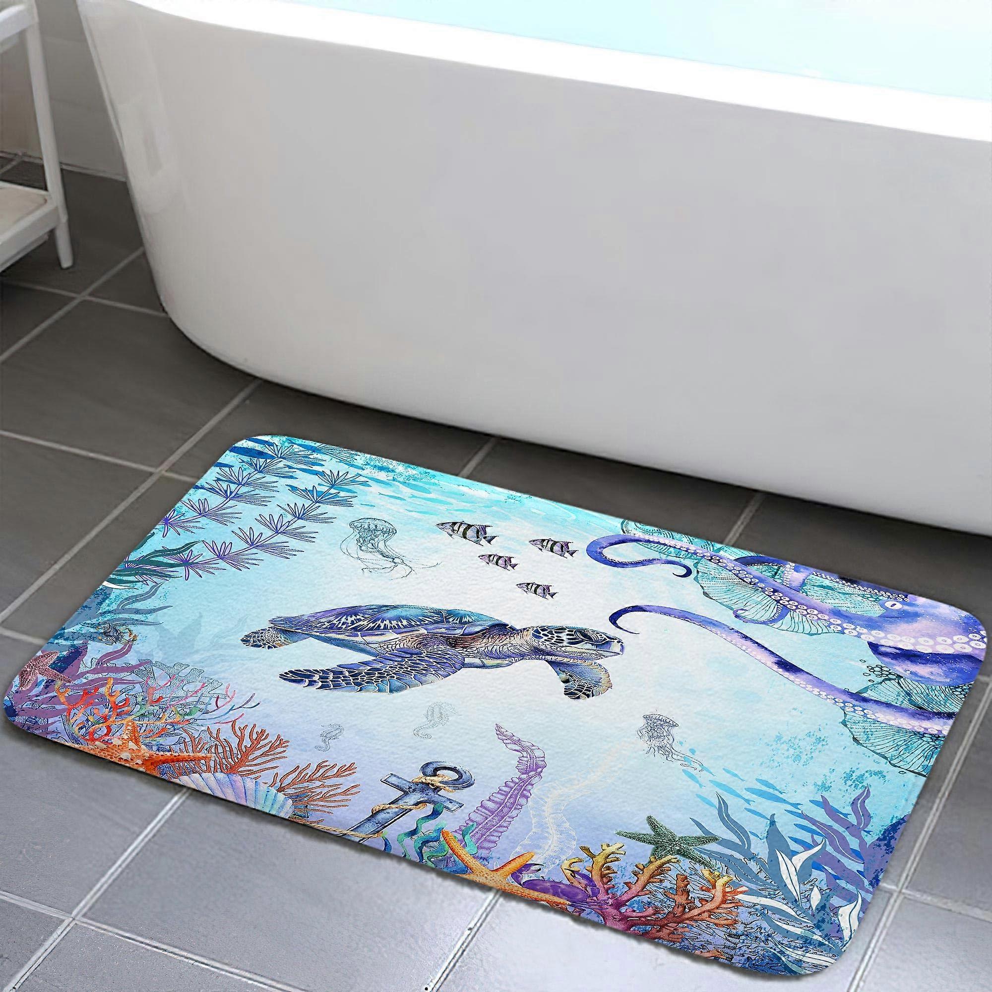 Sea Turtle Octopus Bath Mat Non Slip Soft Coastal Ocean Rug for Bathroom Kitchen 17x29