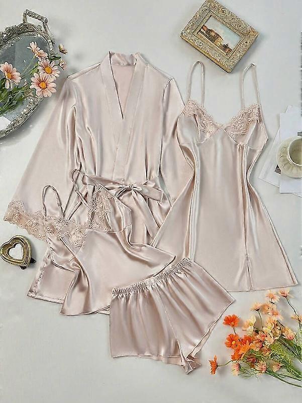 SilkySpell 4pcs Set: Embroidery Lace V-Neck Faux Silk Camisole Nightgown + Camisole Top + Shorts + Bathrobe Silk Pajama Set Women Satin Slee