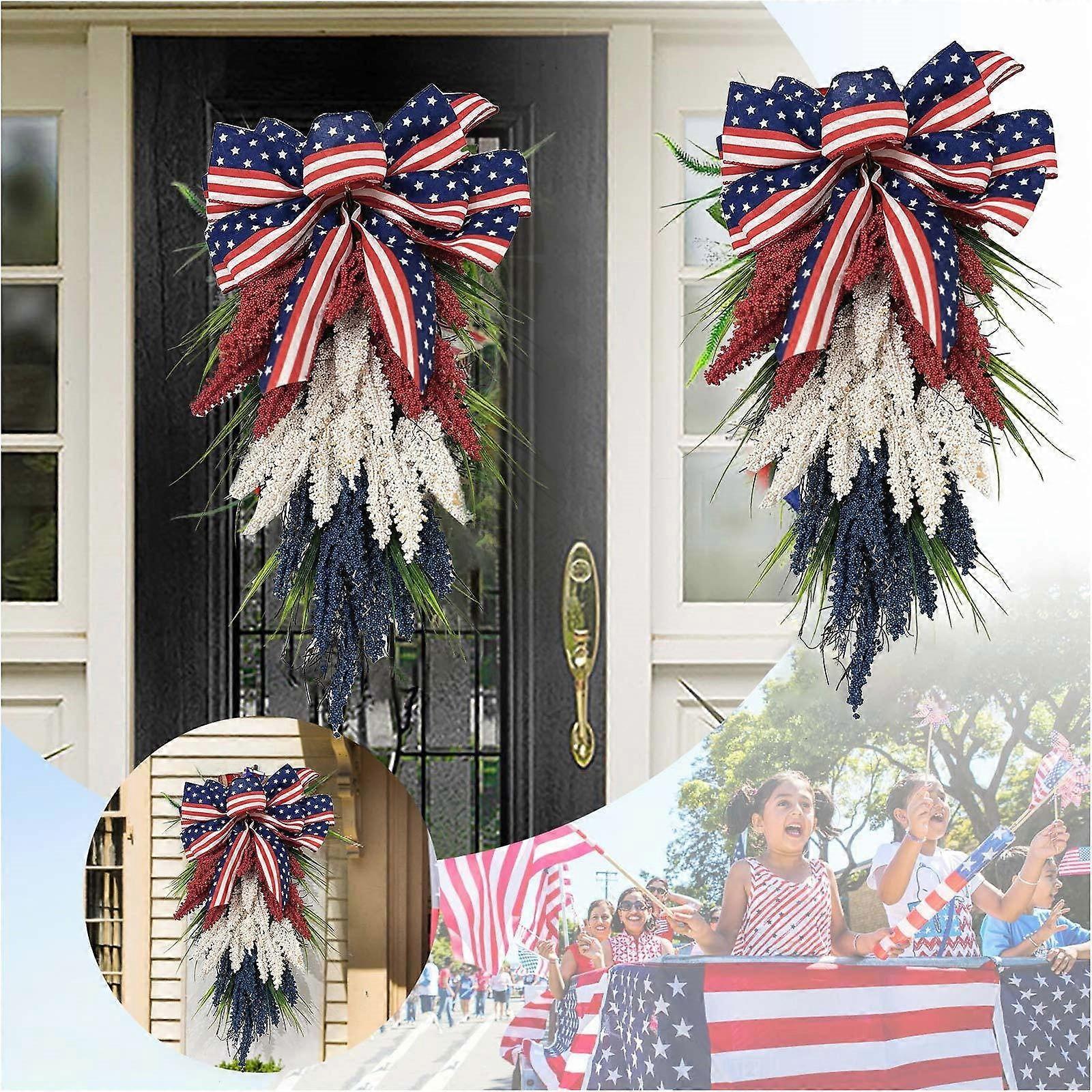 Miayilima Patriotic Front Door Wreath, 4th of July Teardrop Pendants with American Flag Bows, White Blue Red Hanging Decor for Independence Day,
