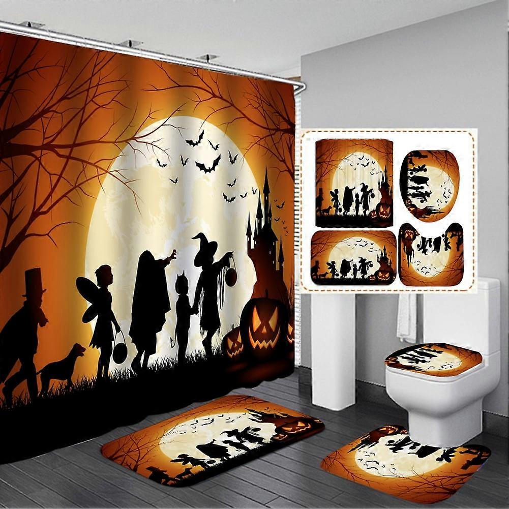 4 PCS Halloween Shower Curtain Set with Non-Slip Rugs, Toilet Lid Cover & Bath Mat, Compatible with Pumpkin Castle Witch Design, 12 Hooks