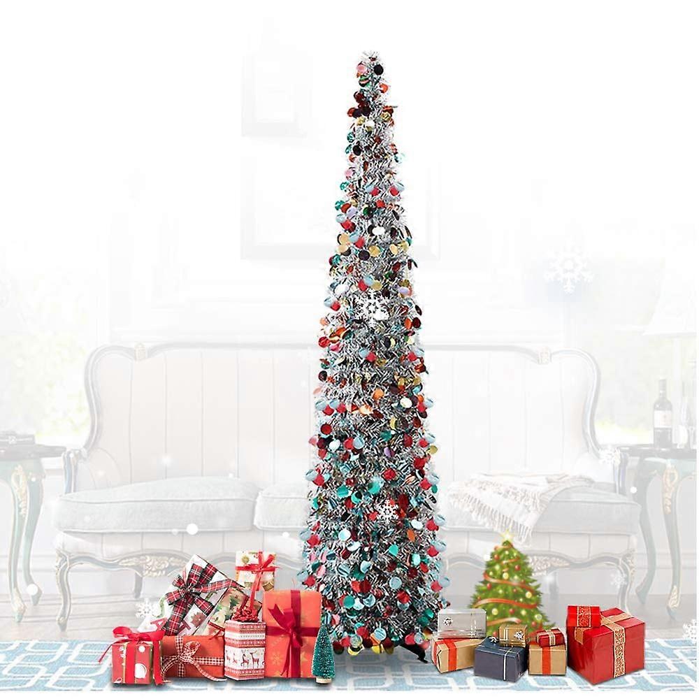 5ft Pop Up Christmas Tree - Silver Shiny Tinsel, Collapsible & Easy-Assembly Artificial Tree for Home, Party, Office, Fireplace Decor