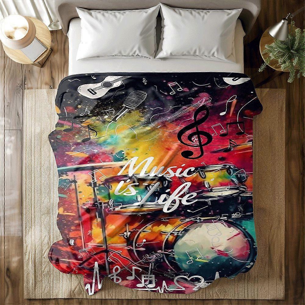 Music-Themed Fleece Blanket with Drum & Guitar Design - All-Season Plush Soft Bedspread for Musicians, Drum & Piano Keys-POIUY154