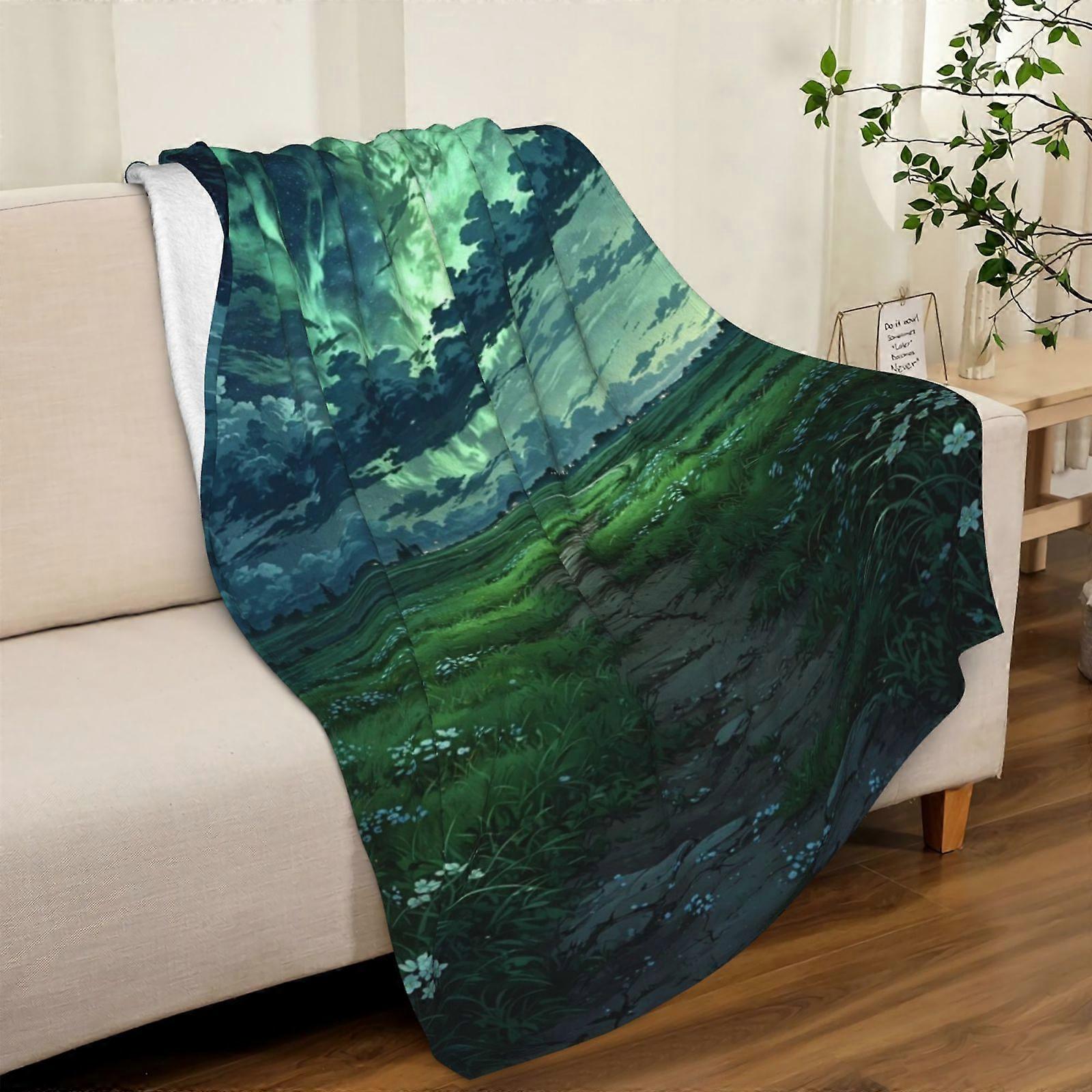 All-Season Flannel Blanket - Soft Warm Throw with Green Landscape, Dark Blue & Teal Nature Design - Perfect for Bed, Cou-POIAS234