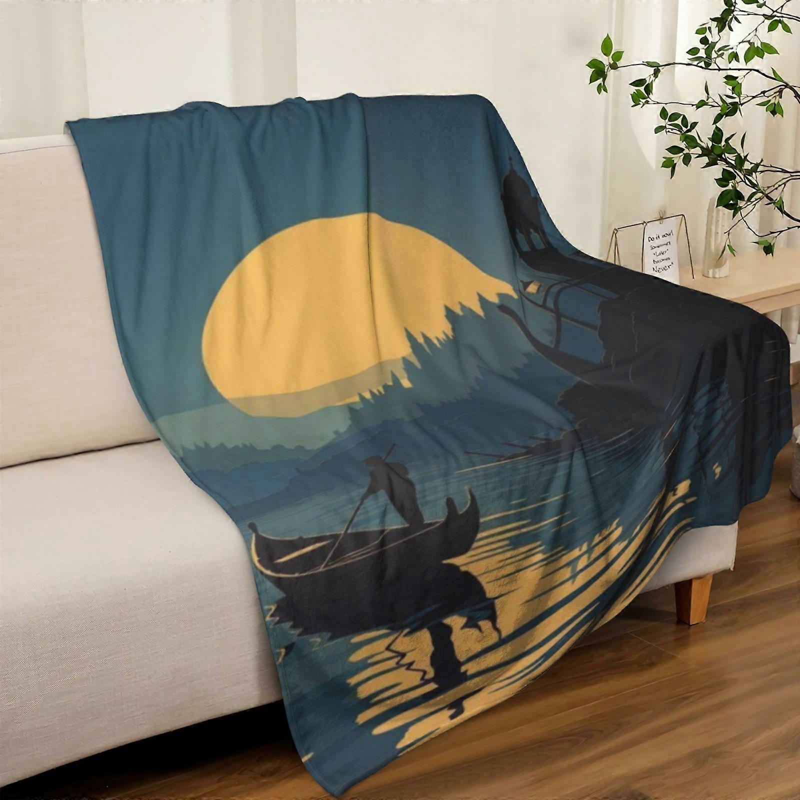 Gondola Under Moonlight Floral Lakeside Throw Blanket - Navy Blue & Golden HD Printed Flannel All-Season Couch, Bed, Cam-POIAS328