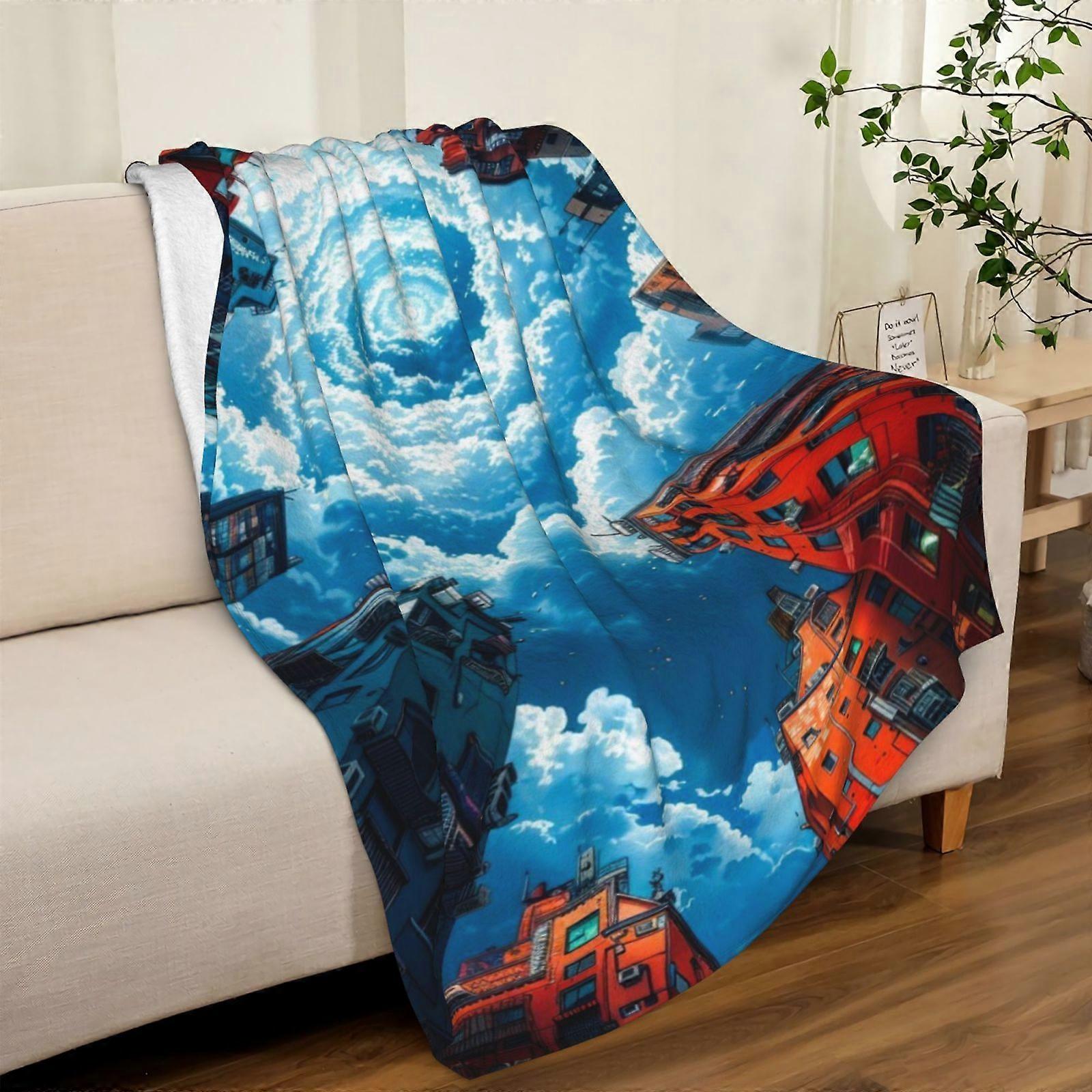 Swirling Clouds & -Inspired Tokyo Tower Skyline Blanket - Ultra-Soft Plush All-Season Bedspread, Multicolor Blue/Red/Nav-POIAS446