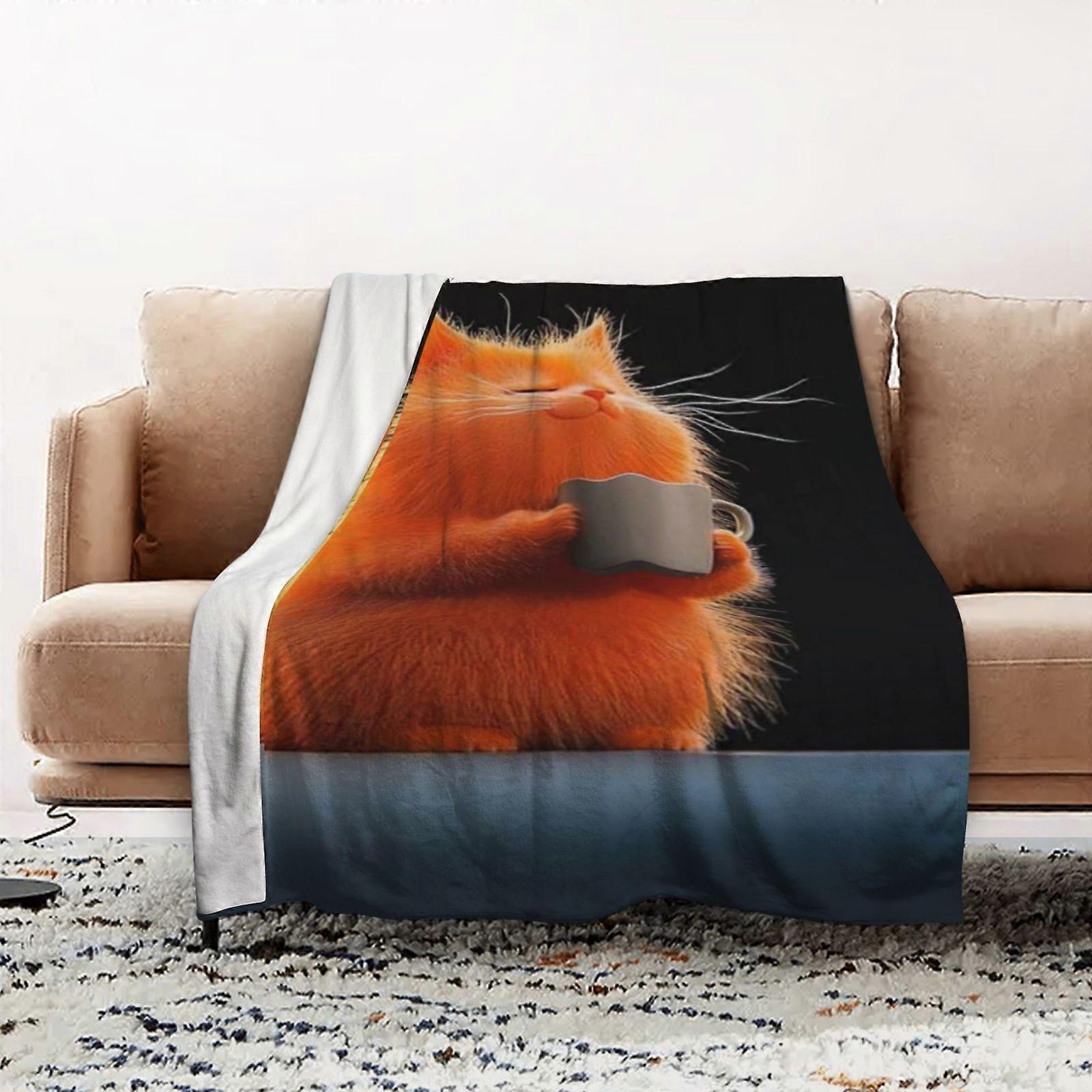 Soft Flannel Blanket - Cute Orange Tabby Cat Drinking Coffee Design, All-Season Cozy Throw for Couch, Bed, Office, Campi-EDFGH54