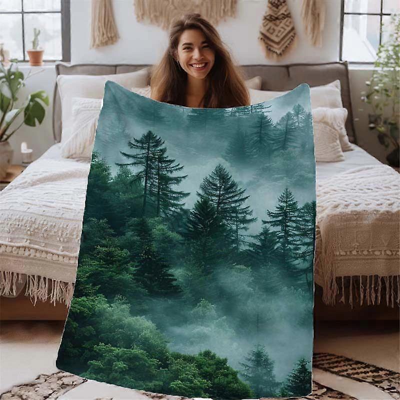 Cozy Forest Scene Flannel Blanket - Soft Polyester, All-Season Throw with Misty Green Nature Print, Perfect for Gifts, H-LKJAS307