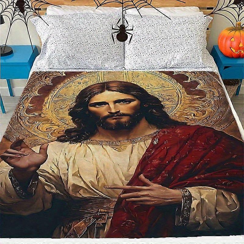 Jesus Christ Golden Halo Blessing Gesture Print Flannel Blanket - Cozy Polyester Decor for Office and Home, Lightweight -TREAX166