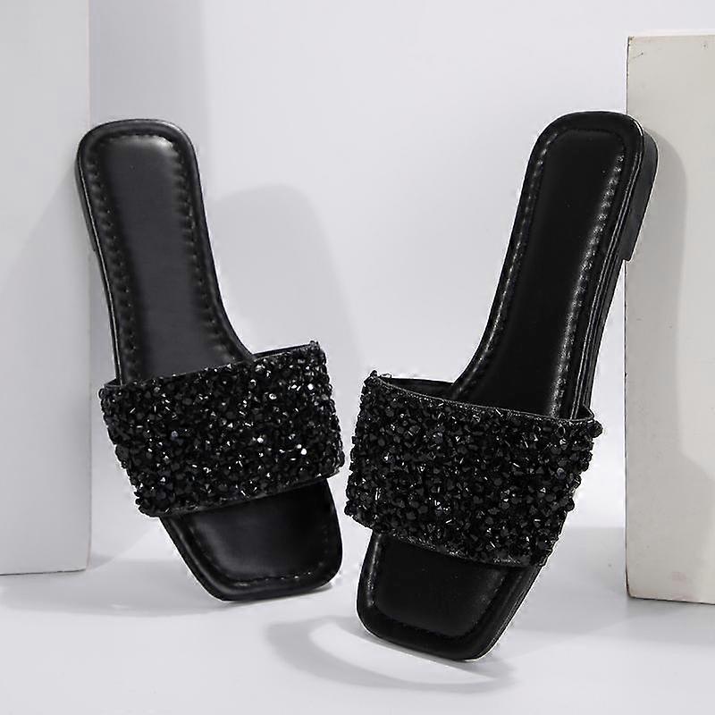 Women's Rhinestone Casual Fashion Slippers Summer Beach Slippers Indoor and Outdoor Square Open Toe Flat Bottom Sandals Girl Black Comfort p