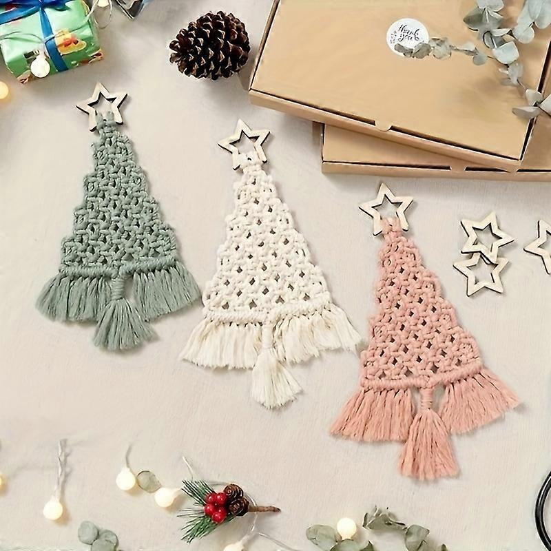 3pcs Macrame Christmas Tree DIY Kit - Beginner-Friendly Knitting Craft Set in Emerald, Cream & Pink - Perfect Holiday Gift